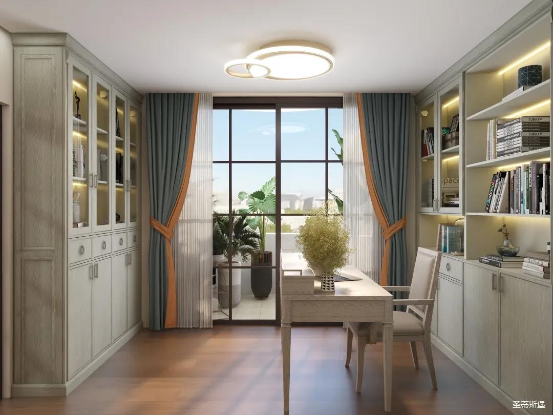 ▲书房设计不放过每一面墙,实木铺满整个空间,亲近自然的静谧感油然而生,阳光透过玻璃洒进来,落在地面上形成斑驳光影,一本喜爱的书、一杯咖啡、沉浸在阅读的乐趣之中,时光荏苒、岁月静好。